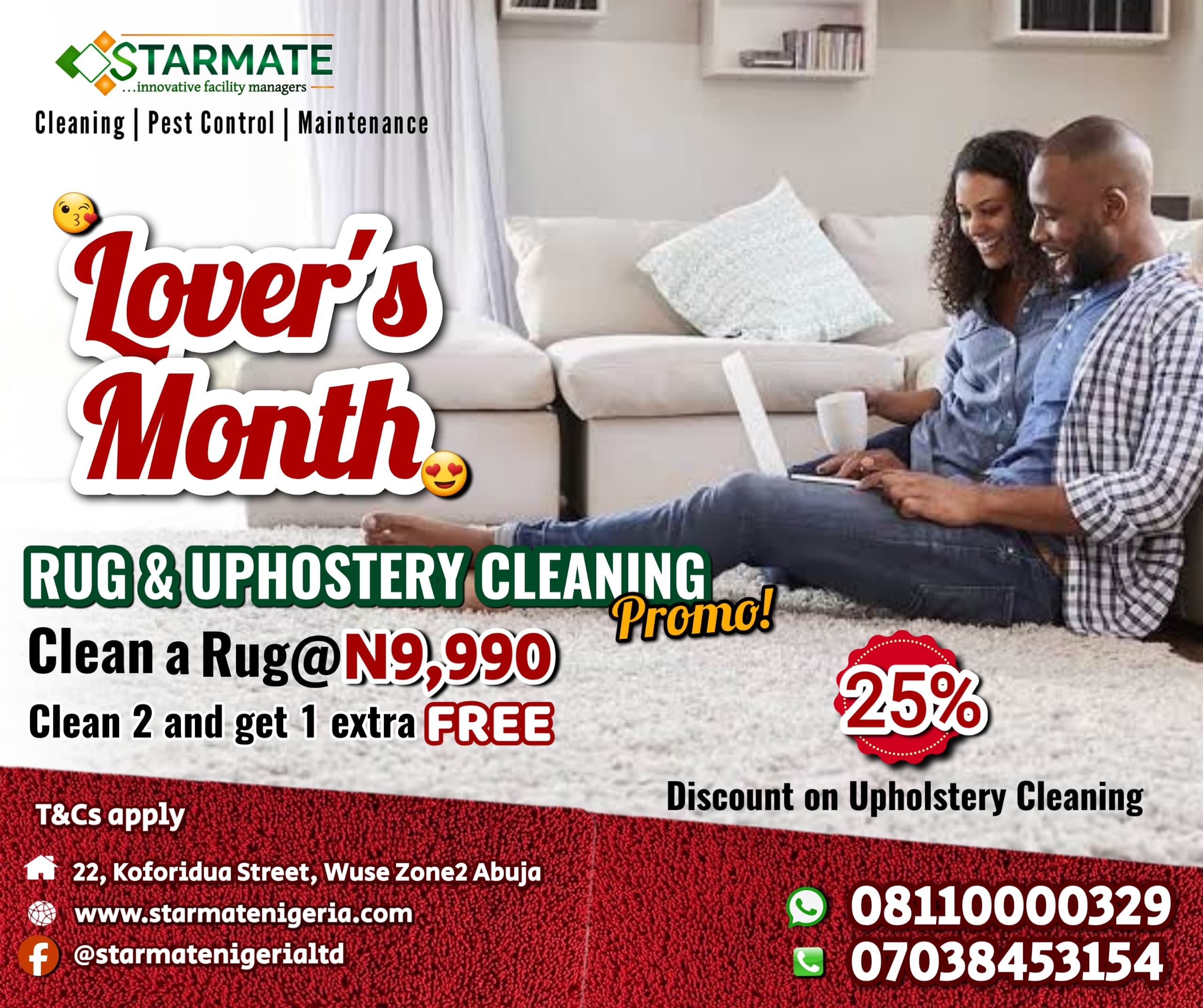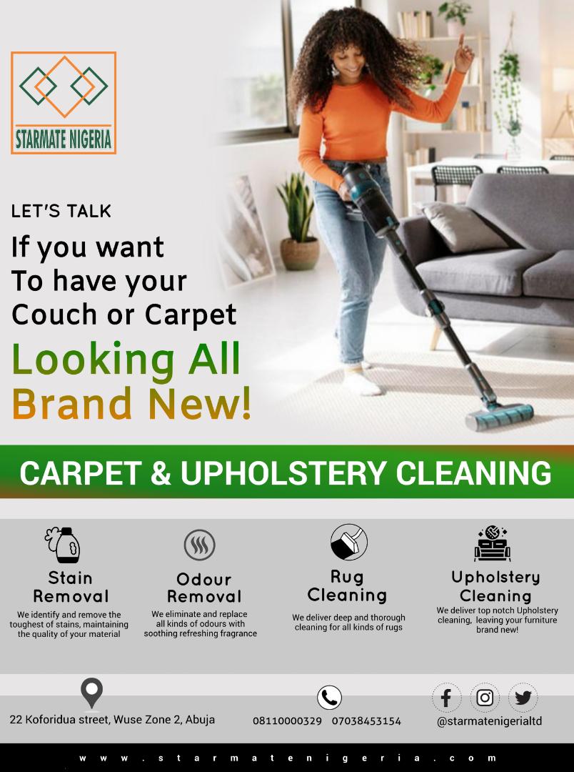 Looking for a reason to refresh your home or office space? Starmate Nigeria Ltd is giving you more than one! Take advantage of our limited-time Rug and Upholstery Cleaning Promo and enjoy sparkling clean furniture and rugs without breaking the bank.